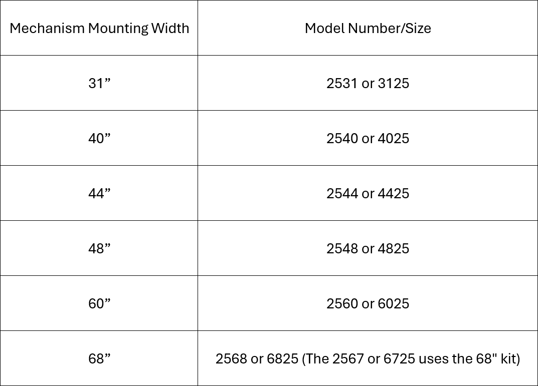 68" Wide: 2568 or 6825 (The 2567 or 6725 uses the 68" kit)
